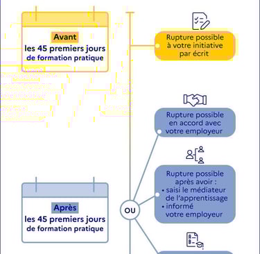 À noter : Lorsque le contrat d'apprentissage est rompu avant son terme, l'employeur notifie sans délai la rupture à l'opérateur de compétences, qui informe les services du ministre chargé de la formation professionnelle. La notification peut être faite par voie dématérialisée.