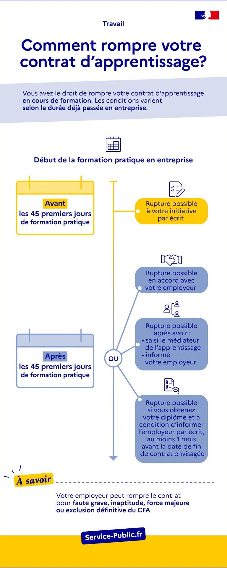 Le contrat d’apprentissage peut être rompu par l’employeur ou l’apprenti (ainsi que son représentant légal s’il est mineur) au cours des 45 premiers jours de formation pratique en entreprise, qu’ils soient consécutifs ou non.